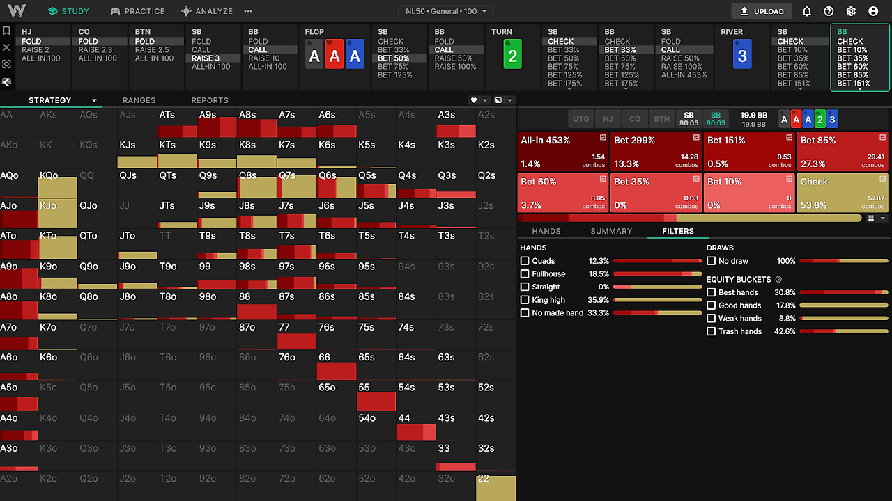 예를 들어서 블라인드 vs 블라인드 상황의 A♠A♥A♦2♣3♦ 보드가 깔렸다고 칩시다, BB는 자신의 레인지를 쿼드나 풀하우스같은 벨류핸드랑 가장 약한 핸드는 블러프로 폴라시키고, 중간수준의 핸드는 첵백하겠죠.
