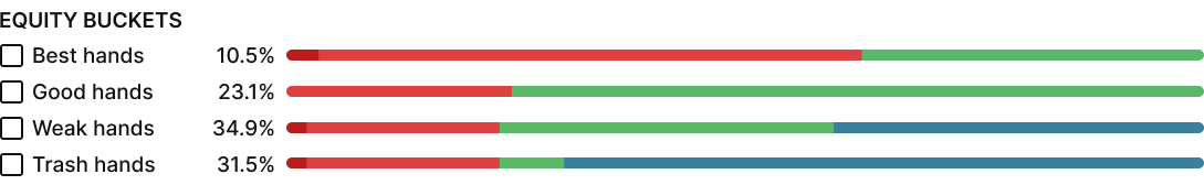 우린 이런 에쿼티 분포를 볼 수 있습니다. 베팅 레인지는 "베스트 핸드 (75% 에쿼티 이상)"을 포함하고 있고, 트레쉬 핸드 (33% 에쿼티 이하)도 있죠. 이런 강하거나/약한 분포는 폴라의 정의입니다.
