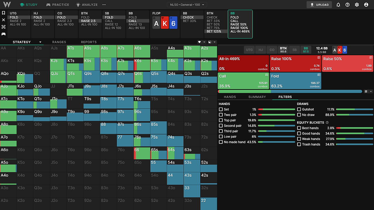 merged된 레인지는 리니어와 폴라 전략 그 어디 사이로 생각될 수 있죠. 우리는 BB vs BTN 3벳 레인지를 보면서 이 패턴을 볼 수 있어요.