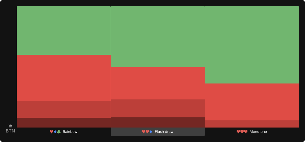 수딧된 플랍은 커넥된 플랍이랑 비슷한 경향을 보입니다. 레인보두 플랍은 가장 플레이어들이 맞추기 어려울거고, 가장 많은 빈도로 베팅합니다. 플러쉬드로우 플랍은 전체적 베팅 빈도는 감소하나 폴라(양극성)은 살짝 커집니다. 마지막으로 모노톤은 베팅빈도와 사이즈가 아주 급격히 감소합니다.