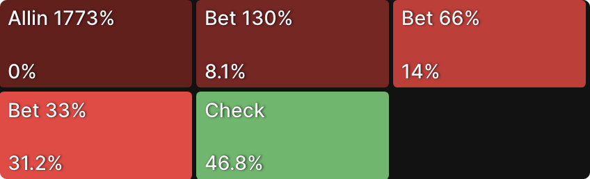 OESD가 가능한 보드에서는 강한 핸드의 정의가 후반 스트릿으로 갈 수록 변하기 쉽습니다, 그래서 폴드 에쿼티와 프로텍션을 위해 베팅사이즈를 키우는 전략이 좋은 선택이 될 수 있습니다. 여기에는 66%의 베팅 사이즈가 자주 쓰이고, 전체적인 베팅빈도는 낮아집니다. 레인지가 새롭게 폴라되서 그렇습니다.