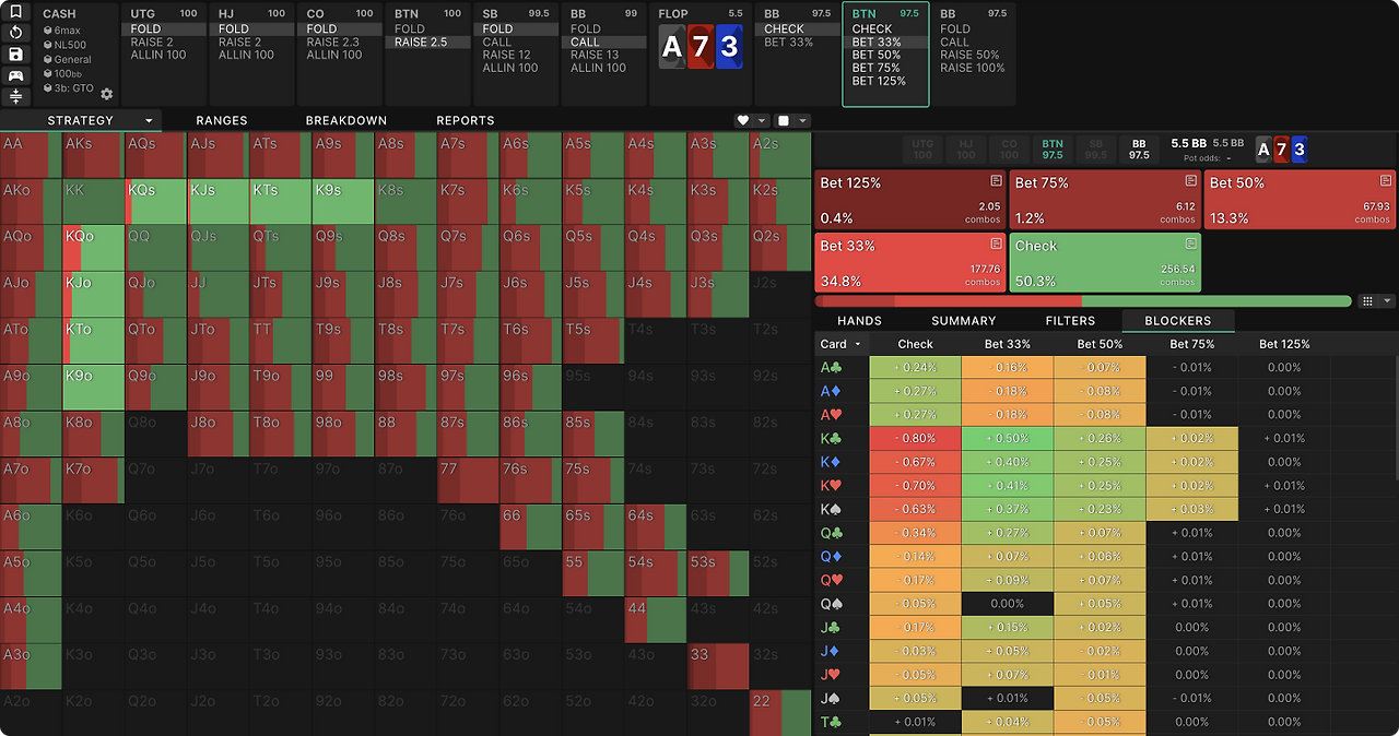 - 스트레이트나 플러쉬가 완성된 보드에서는 베팅 빈도를 줄이고 사이즈를 작게 가져간다.